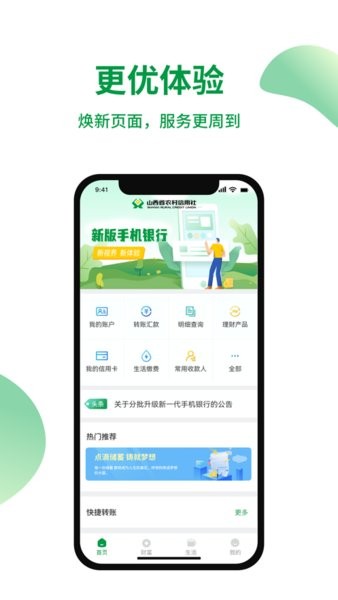 山西农信app官方正版是为智能手机用户量身定制的移动金融服务平台,具有账户查询、行内转账、跨行转账、当面付等功能。让您只有有网络的情况下,具有随时随地可以操作自己的账户。山西农信新版手机银行对功能进行全新升级,从客户视角塑造更安全、更便捷、更懂你的线上金融平台。