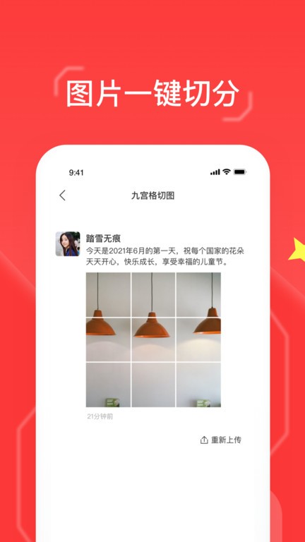 社交平台晒原图太单调,九宫格切图,为您带来焕然一新的晒图体验。告别复杂的作图操作和图片设计能力,轻轻松松一键切图。成果图超清美观不失真,更可以直接分享,让你玩转微博,微信朋友圈和ins。