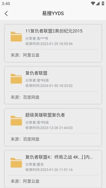 易搜-网盘搜索最新版本是很全面的网盘资源搜索神器app,可以搜夸克网盘、百度网盘、迅雷云盘和阿里云盘;软件使用也很简单,输入要搜索的名称,点击一下,结果立马出来,选择需要的网盘链接,进入即可!