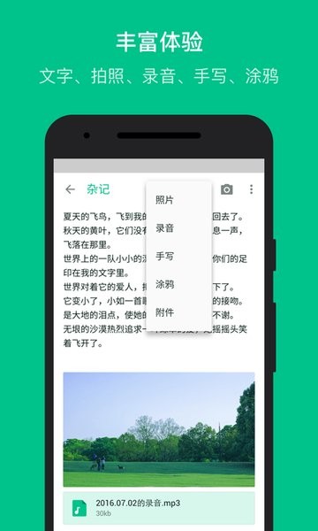 丰富的笔记体验,包含文本模式和清单模式,支持拍照、图片、录音、手写、涂鸦和文件