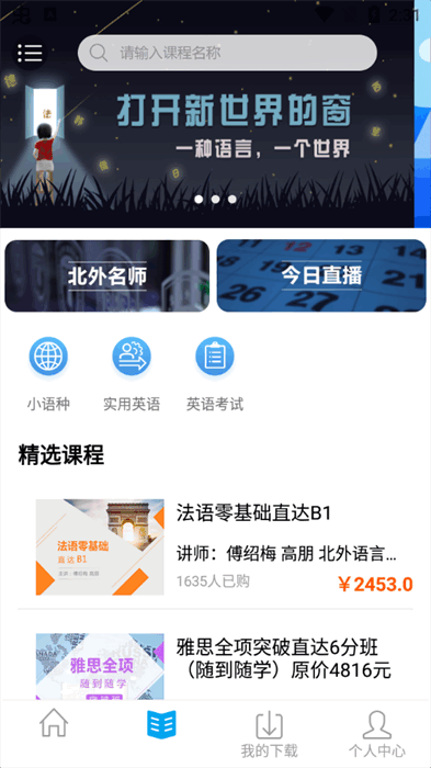 北外网课app,一个专业的外语学习软件,这里有众多专业名师在线指导教学,也有众多的课程资源提供给大家学习了解,凭借强大的技术打造了便捷的网络学习环境,让你直接在手机端就能系统全面的学习,实用性极强,有需要的朋友快来下载用起来吧~