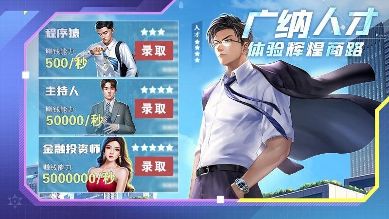 玩家可以通过投资、商战、金融战争、宴会等玩法,获得提升人才能力和建筑等级的道具,在竞争激烈的商业环境下,对抗金融巨头,打造自己的商业帝国。通过游戏,玩家能获得经营策略思维、人才团队培养思维的锻炼,体验创业的乐趣,感受商战对抗的紧张激烈和波谲云诡。