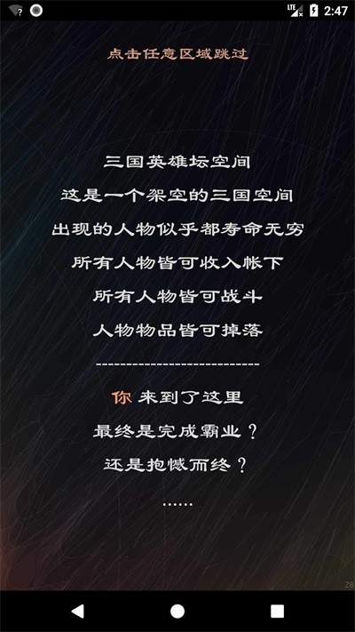 游戏全程采用了文字模式,完美还原了三国历史中发生过的重大事件,玩家可以通过精彩的文字叙述来深度体验真实震撼的三国乱世风云。游戏中玩家需要控制一名武将,通过招兵等形式扩充自己的实力,利用各种道具和武器来快速提升自己的战斗力,并通过与其他武将战斗,获取一场又一场的胜利,最终迎来属于自己的霸王之业。