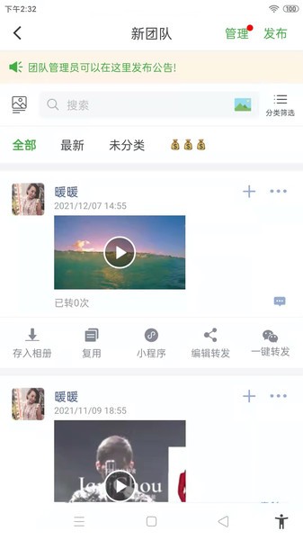 1、创建自己的团队,添加发布素材,支持相册选择和拍照;
