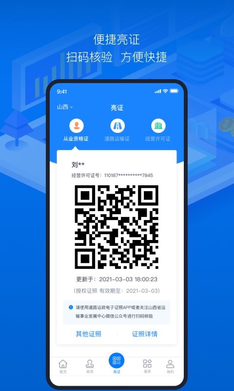 软件与山西等省市道路运输电子证照系统和运政管理系统进行数据对接和业务协同,向道路运输经营业户和从业人员提供道路运输经营许可证、道路运输证和从业资格证三类电子证件的在线申领、亮证、授权及线上运政业务办理服务,为行业管理部门提升数字化便民服务水平及监管能力,打造数字化运政服务体系提供支撑。