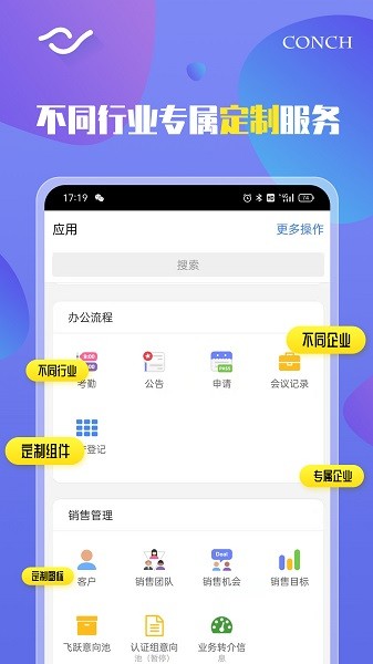 软件上也会有丰富的办公功能,办公人员可以自定义管理自己的名片,还可以让你查询客户信息。