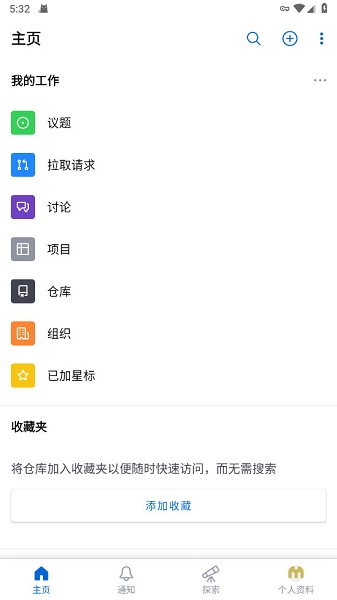 4、登陆成功后,将会出现个人的github手机版主页,可以对Repository(代码库),pull request(代码审查),Issue(问题),Organization(组织)等进行操作和管理