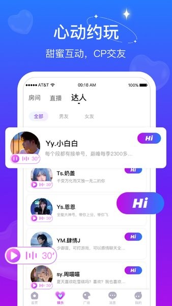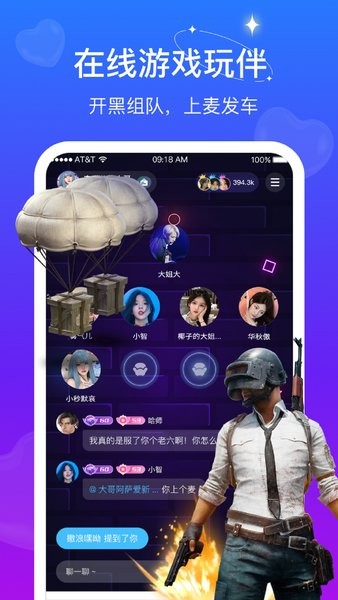 多人语音聊天室,实时声音速配,海量优质高颜值大神和你配对处CP,语音连麦、K歌点唱、相亲娱乐、扩列玩伴,用声音触达社交;音乐房间集齐各路甜音蜜嗓,声优歌姬尽情聊,你想听的这里都有;