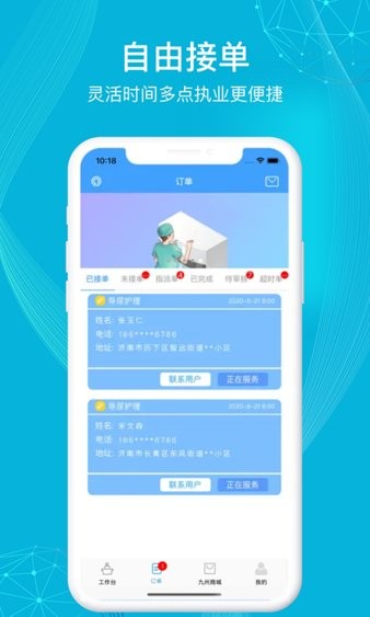 九州医护为医护提供专门的应用医护端,方便医护日程、服务项目管理等。