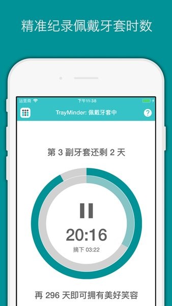 TrayMinder 是您获得美好笑容过程中的最佳搭档,帮助您达到最佳治疗效果。您可以用它来记录每天佩戴牙套的时数。若长时间摘下牙套,TrayMinder 会自动提醒您该再次佩戴。到该换下副牙套的时候,您也会收到即时的通知。此外,您还可以利用牙齿自拍功能来纪录治疗全程进度。