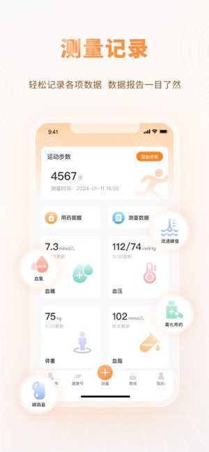 3、升级测量功能:轻松记录血糖、血压等9项健康数据,趋势图表一目了然;