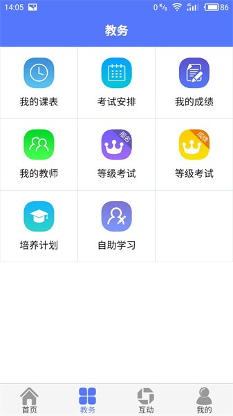 我的课表、考试安排、我的成绩、我的老师、等级考试、培养计划.