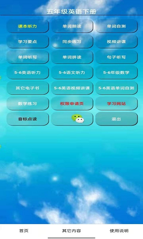 1、小学英语五年级(上册)下册所有课文、单词的翻译、朗读。(单词朗读有二种模式:纯英文读、中文-英文,方便记忆)