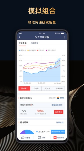 3、支持模拟投资组合,用户可以通过应用模拟各种不同的投资组合,深入研究;