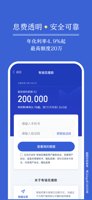 “有钱花”是度小满旗下信贷服务,利用人工智能和大数据风控技术,为用户提供方便、快捷、安心的借款服务。