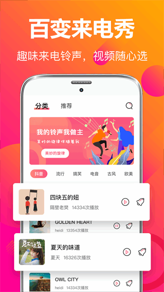 来电秀彩铃app,一款专门用于设置手机来电铃声的应用服务软件,平台上有大量的彩铃类型提供给大家选择,让用户直接在手机端就能设计来电铃声、铃声桌面、主题等,且整个操作过程十分的简单,实用性极强,是大家日常必备的彩铃工具哦,有需要的朋友快来下载用起来吧~