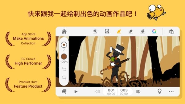 多样化的拟真触笔效果、橡皮擦及填色工具,创作出专属风格的动画短片、视频。