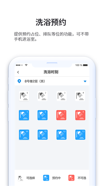 提供预约占位、排队等位的功能,可不带手机直接进浴室。