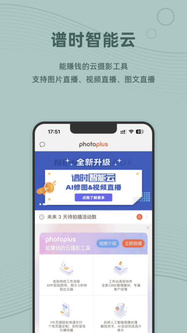 谱时智能云最新版是一款提供云摄影拍照服务的应用app,可以适应不同场景,支持多种文件类型,随时连接适配相机单反设备,轻松进行拍摄,不同拍摄方式随你选择,还可以通过图片视频直播赚钱,让你的图片飞起来,在线免费创建相册,操作简单!