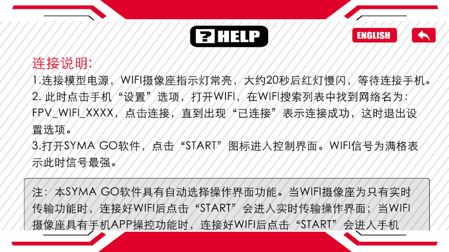 1.连接模型电源,wifi摄像座指示灯常亮,大约20秒后红灯慢闪,等待连接手机。