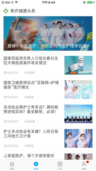 功能方面有【医直播】、【转诊】、【签约】家庭医生等,亮点包括正规服务、订单中心、个人中心、专业护士资源、保险保障以及丰富的资讯文章。打开app后滑动查看介绍图片,进入订单中心管理订单,快速浏览资讯内容,最后点击体验按钮进入首页。