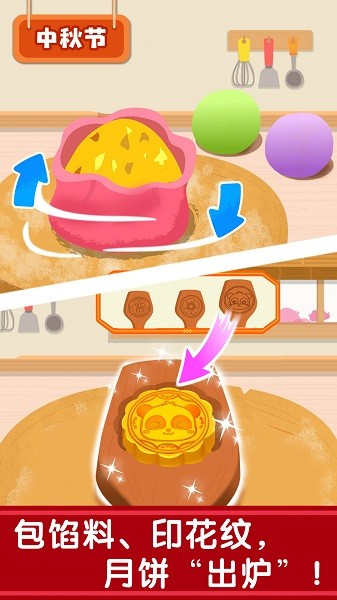 馅料做好后,包入月饼皮中,用带有玉兔、嫦娥等元素的模具,把整个面团压实……哇,宝宝做出来的月饼真漂亮呀!