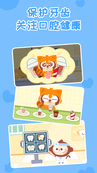 [克服恐惧] 以可爱的卡通画面,真实模拟医院拔牙、洗牙、补牙、治疗的场景,让宝宝充分理解牙医的职业,克服恐惧;