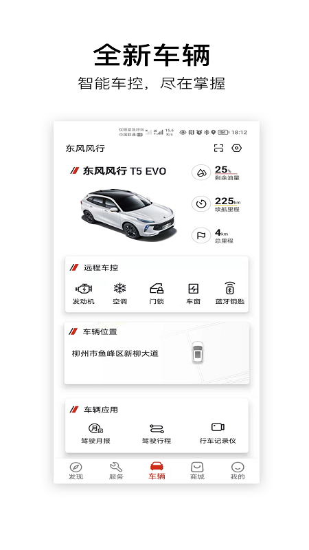 东风风行手机互联,集发现、车主服务、商城、车辆与于一体的车主服务平台,拥有更智能化的车载服务。