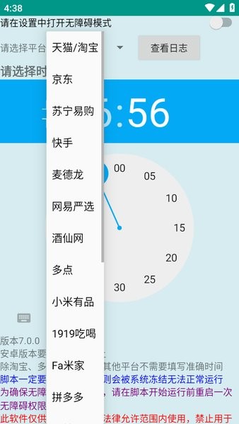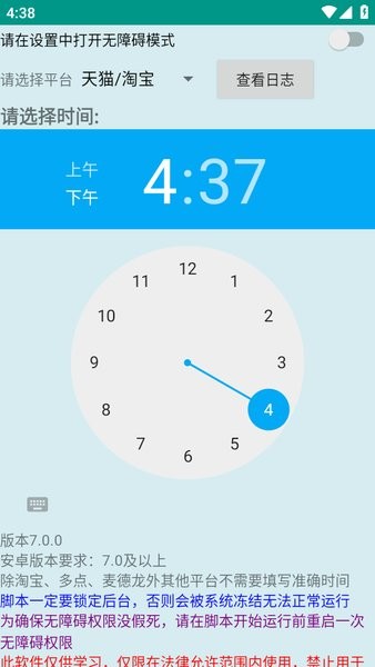 除淘宝、多点、麦德龙外其他平台不需要填写准确时间却本一定要锁定后台,否则会被系统冻结无法正常运行为确保无障碍权限没假死,请在脚本开始运行前重启一次无障碍权限。