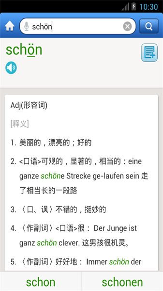 2、德语和汉语词条、德语例句均配清晰发音,让你摆脱哑巴德语;
