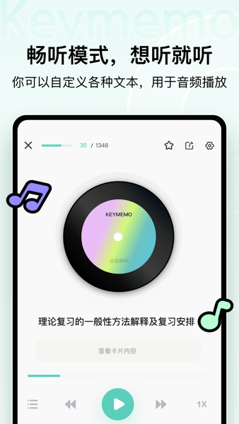KeyMemo背诵记忆官方版是提供学习卡记忆练习的应用app,支持练习模式,务实知识点掌握程度,支持闪卡模式,掌握情况,标记划分,还提供畅听模式,随时随地想听就听,自定义各种文本,全场景覆盖,学练测评一体化,全方位记忆提升!
