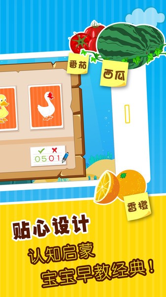 APP通过趣味问答的形式,让宝宝学习到动物、水果、蔬菜、国旗、交通工作、身体部位、生活用品、家用电器等多种知识主题;
