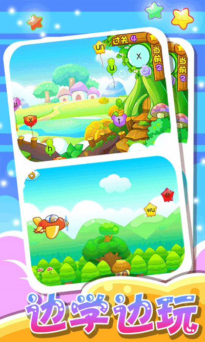 1.将各种汉语拼音表格制作成了不同的立体的图片,上面有众多的卡通元素,可以吸引用户的注意力。