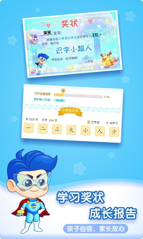 小伴龙,让每一次陪伴都是成长!小伴龙识字,根据幼儿认知发展规律,专为孩子量身打造的认字识字启蒙App。
