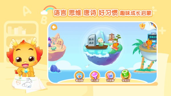 1、设计了小伴龙的卡通形象陪伴孩子学习,能够打造互动式的学习环境;