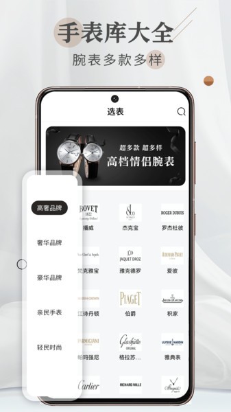 懂表帝助手是一款介绍各种品牌腕表的应用软件,专注于钟表行情,实时更新各种腕表资讯,今日爆款、热门板块内容轻松了解,热销榜单尽在掌握,随时查看,覆盖超多款式,多种多样,自由浏览发现,帮助掌握更多腕表知识内容!