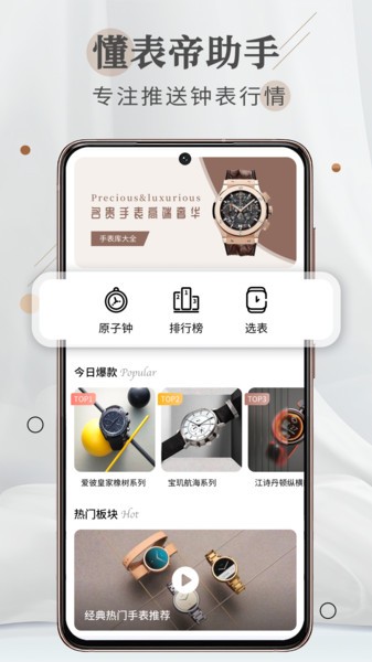 懂表帝助手是一款介绍各种品牌腕表的应用软件,专注于钟表行情和实时资讯更新,用户可以轻松了解今日爆款、热门板块以及热销榜单。应用内覆盖了超多款式的手表,从顶级到亲民品牌一应俱全,满足不同用户的选表需求。懂表帝还提供了丰富的手表知识、购表指南和真假鉴定等内容,帮助新手更好地了解手表文化和保养技巧。