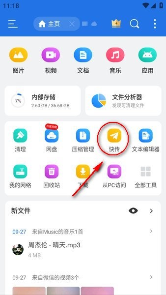 在“首页”点击“快传”,看下图的位置;如果没有,就在“全部工具”里面找;