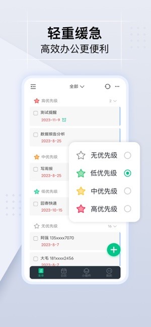 - 优先急缓:支持为待办事项标注优先级,让自己更加专注。
