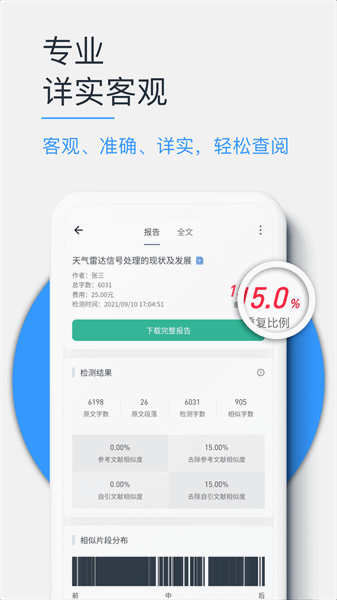 1、拥有专业的论文查重检测系统,匹配海量资源数据库,针对期刊论文、sci论文等均可轻松完成查重。实现通过手机满足不同用户对不同论文格式的查重需求。