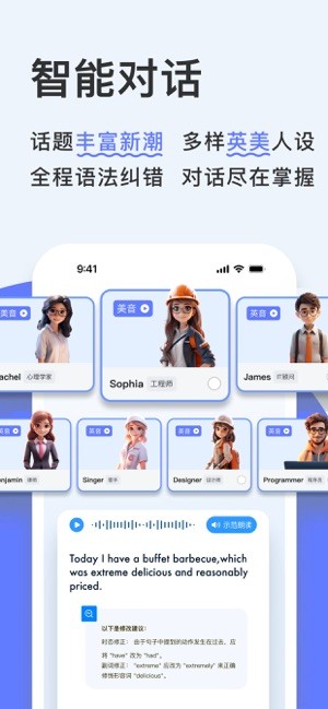 --话题丰富新潮,多样英美人设,全程语法纠错,对话尽在掌握