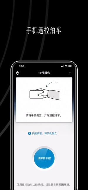当您需要泊车时,选择一个空闲停车位,下车并站在车旁,长按手机按钮并将手机侧立,即可遥控移动车辆至停车位。