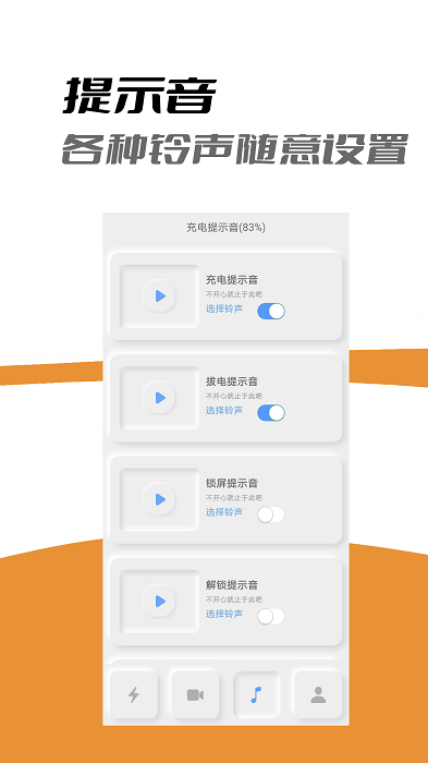 2、充电提示音、拔电提示音、锁屏提示音、解锁提示音、电量充满提示音、低电量提示音,铃声多多,随意设置。