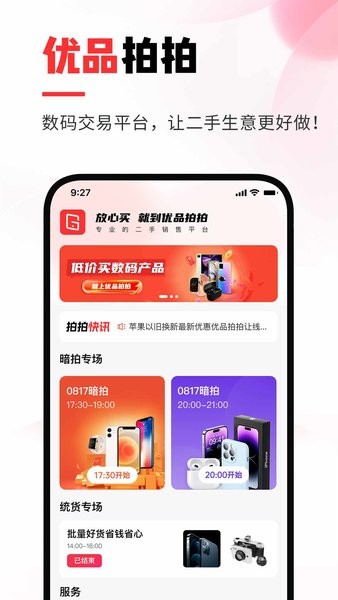优品拍拍最新版本是一款专门用于买卖二手手机和数码产品的软件,平台中的所有二手商品都是经过官方验机的,都是正品,拒绝造假;提供的数码产品非常齐全,有手机、相机、平板、笔记本等,各种型号都有,用户可以自由筛选并购买。