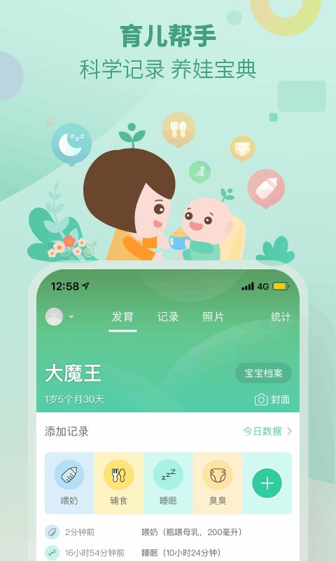 简单的操作,方便记录宝宝饮食、睡觉、排便和成长情况。