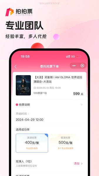 最让我觉得省心的是它的专业团队,经验丰富,多人代抢功能更是大大增加了中票的概率。每次遇到热门演出,我都会用这个软件帮忙代拍,真的解决了不少抢票难题。总之,拍拍票绝对是我看演唱会的必备利器!