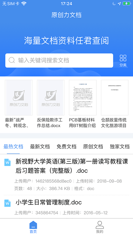这个软件还有一个挺人性化的功能就是“文档认领”,这样可以保护创作者的权益,感觉特别贴心。还有个非法自查的功能,能帮用户降低文档使用风险,这点对工作真的很重要。资源方面也是超级丰富,而且全部免费浏览和下载,甚至还能分享自己的原创内容到平台,感觉是个不错的资源分享社区。
