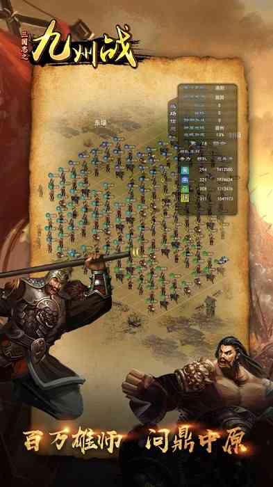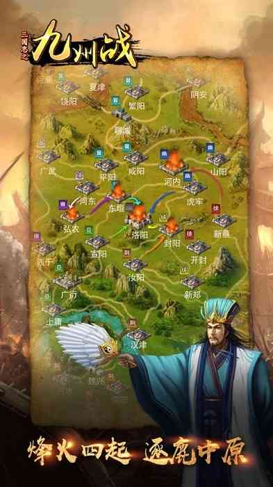 《九州战》是一款以三国时代文化为背景,精美细致的画面风格、真实细腻的游戏场景、恢宏壮阔的战争场面,真实还原三国地图和历史名将,实现十万部队同屏作战,结合模拟建设与战斗策略为一体的策略类手机网络游戏。游戏沿用了SLG经典回合制的战斗模式,拥有丰富多样的策略玩法。