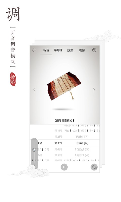 提供:听音模式、十二平均律定弦、扬琴技法,共3种调音模式;