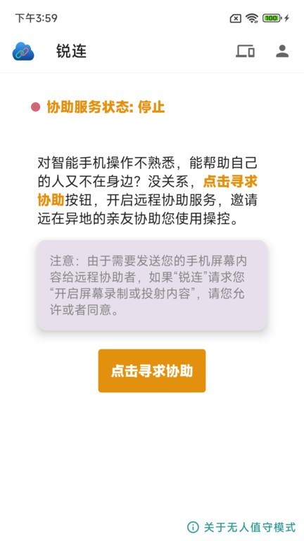锐连远程控制是提供远程服务的应用工具,连接受助者和远程帮助者,简单设置,可以随时对受控手机进行访问和控制,直接远程协助操作,操控受助者手机,方便快捷,简单灵活,指引受助者学习操作手机,有需要的伙伴快来体验吧!
